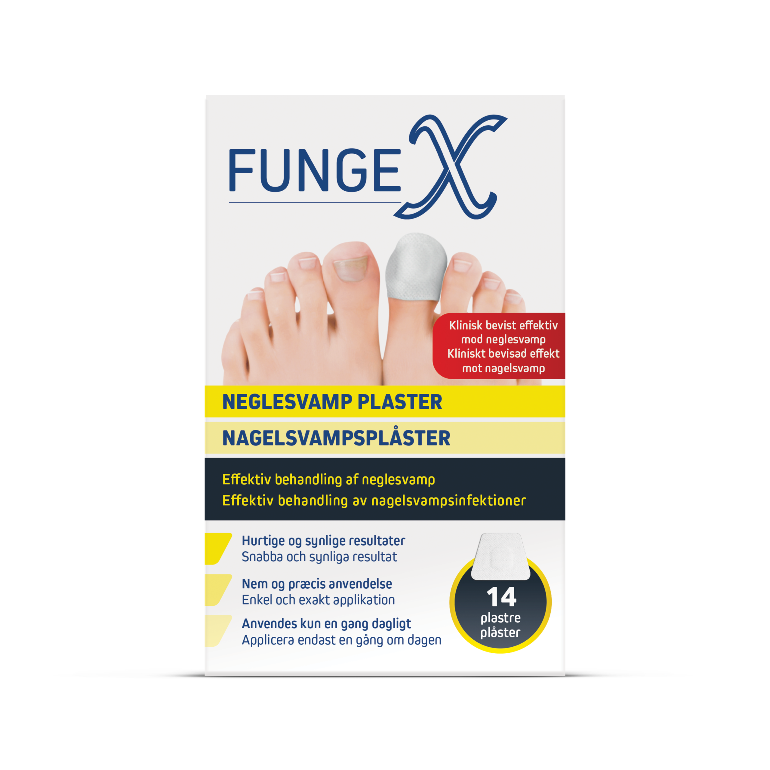 FungeX-plaster til neglesvamp er verdens første klinisk testede og gennemprøvede negleplejeplaster, der er designet til at behandle neglesvamp ved kilden. Det giver naturlig pleje gennem kontinuerlig frigivelse af aktive ingredienser i op til 8 timer. Den unikke formulering betyder, at plasteret også fugter neglene. Den specialdesignede form sikrer en praktisk, hurtig og effektiv, direkte påføring.