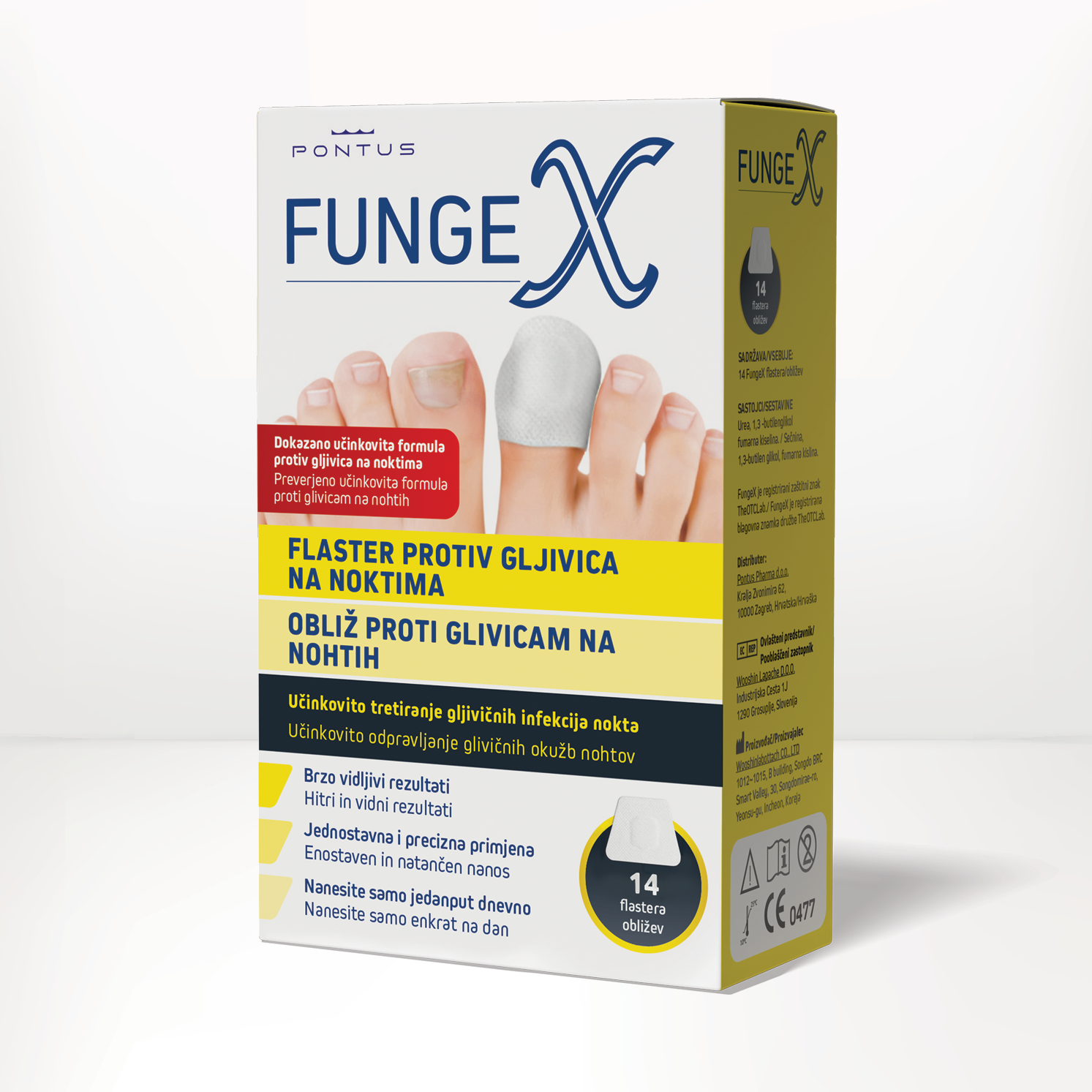 FungeX obliž proti glivicam na nohtih je izdelek za domačo uporabo, zasnovan za učinkovito in intenzivno obravnavo glivic na nohtih, pa tudi razbarvanih in deformiranih nohtov na stopalih. Ponuja naravno nego s stalnim sproščanjem aktivnih sestavin do 8 ur.