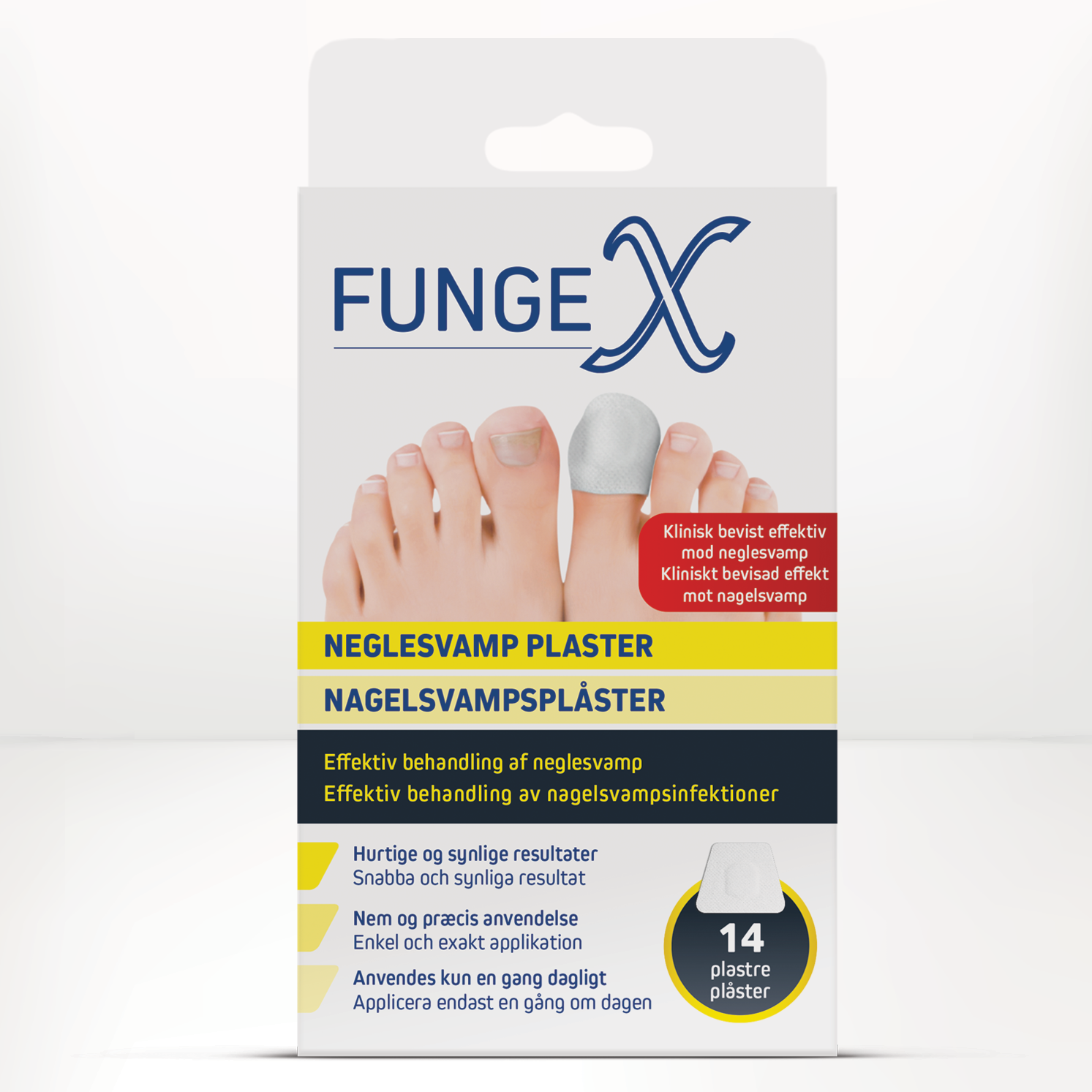 FungeX nagelsvampsplåster är en revolutionerande behandling som är utformad för att effektivt och intensivt behandla nagelsvamp och missfärgade, deformerade (tå)naglar. Den ger naturlig vård genom kontinuerlig frisättning av aktiva ingredienser i upp till 8 timmar.